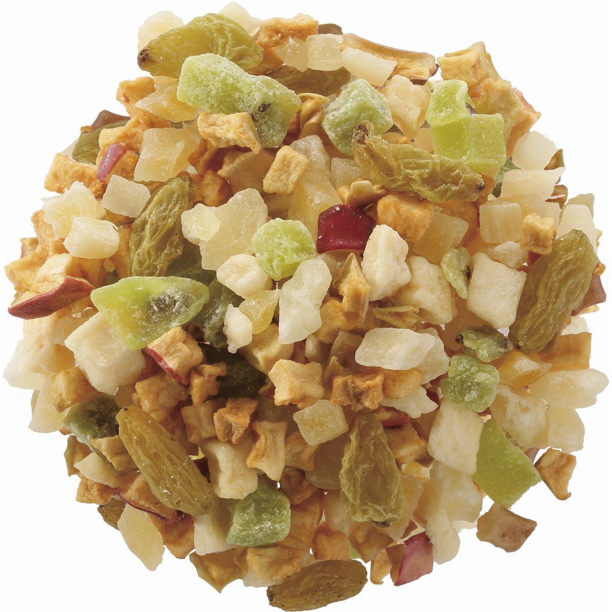 有機ドライアップル【オーストリア】、加糖ドライメロン【タイ】、加糖ドライマンゴー【タイ】、加糖ドライキウイフルーツ【タイ】、フリーズドライアップル【中国】、加糖ドライパイナップル【タイ】、香料、クエン酸、リンゴ酸、着色料(黄4、青1)、保存料(亜硫酸塩)