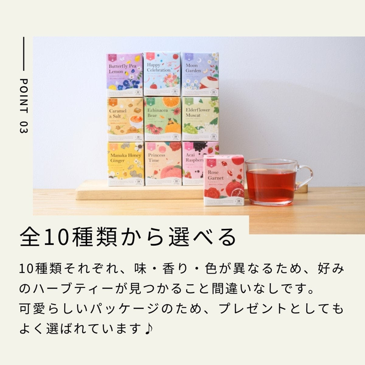 ハーブの持つ本来の風味と効能はそのままに、フルーツやフレーバーを加え、飲みやすさとおいしさを追求しました。