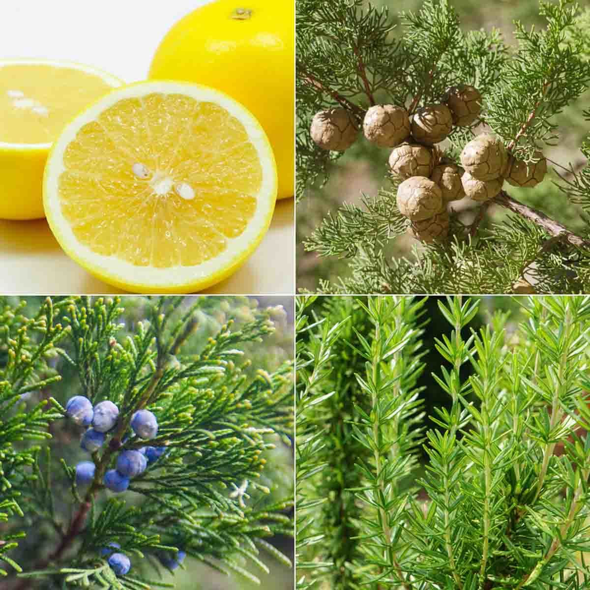 グレープフルーツ精油、サイプレス精油、ジュニパーベリー精油、ローズマリー精油、パチュリ精油