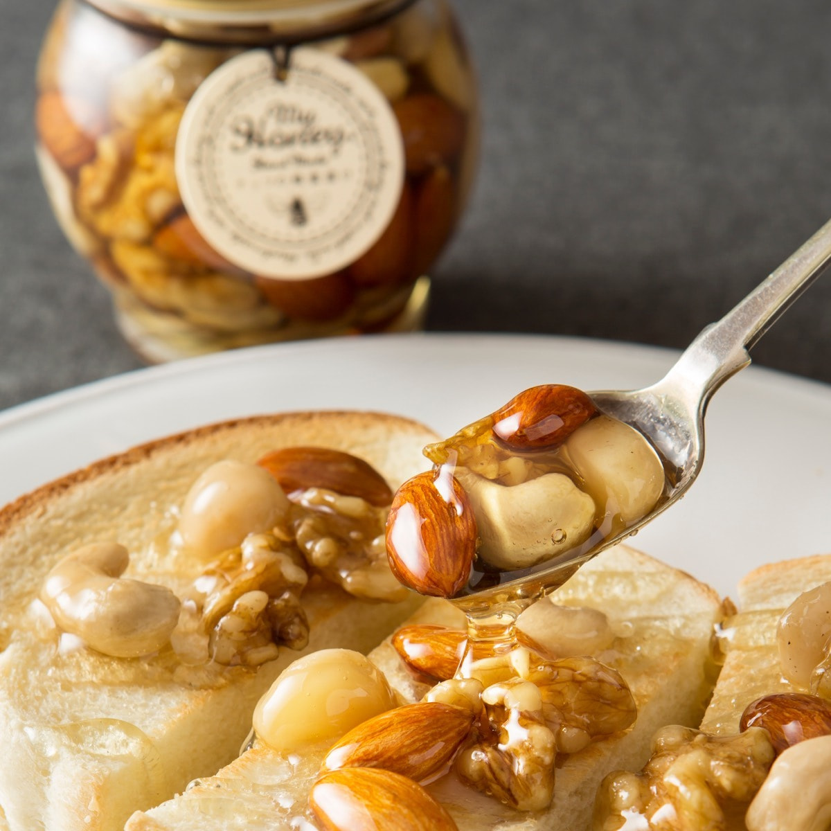 ナッツとハチミツの栄養が一度に摂れるMYHONEY(マイハニー)の「ナッツの蜂蜜漬け」は、「FOODEX JAPAN 美食女子グランプリ」にて金賞を受賞したスーパーフードです。